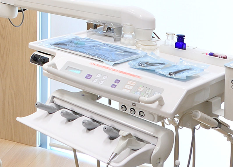 歯科医院で、袋から出された新しい器具で治療をしてもらったことはありますか。当院では、お口に触れるものはすべて、菌を100%死滅させる「滅菌」をした後にパッキングし、治療直前に患者様の目の前で開封することで院内感染予防に努めています。また、器具に注油する機械をメーカーに依頼し開発してもらうなど、開院当時からどこよりも先駆けて、衛生管理に力を注いでいます。
